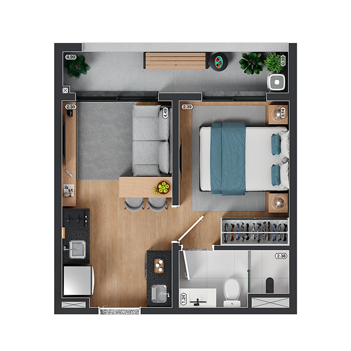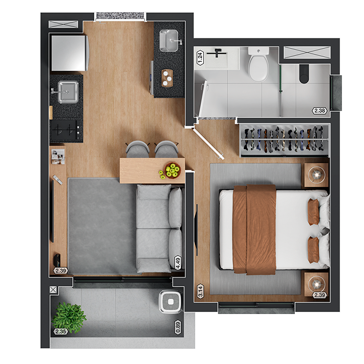 *Sugestão de planta de 1 dormitório equivalente a 27,49m², final 04, do pavimento tipo.