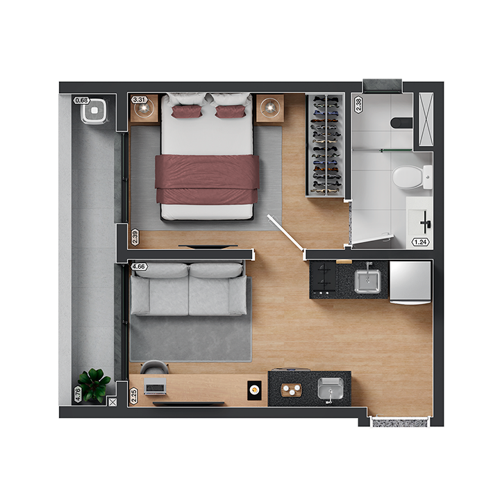 *Sugestão de planta de 1 dormitório equivalente a 31m², final 10 do pavimento tipo.