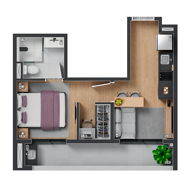 *Sugestão de planta de 1 dormitório equivalente a 29,49m², final 10, do pavimento tipo.