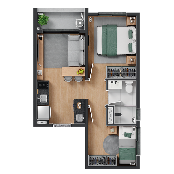 *Sugestão de planta de 2 dormitórios equivalente a 38,47m², final 02 do pavimento tipo.