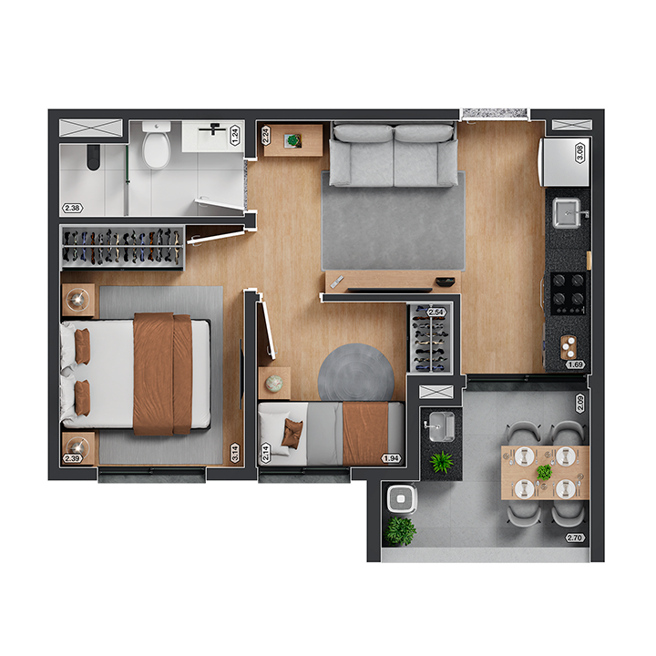 *Sugestão de planta de 2 dormitórios equivalente a 42,73m², final 10, do pavimento tipo.