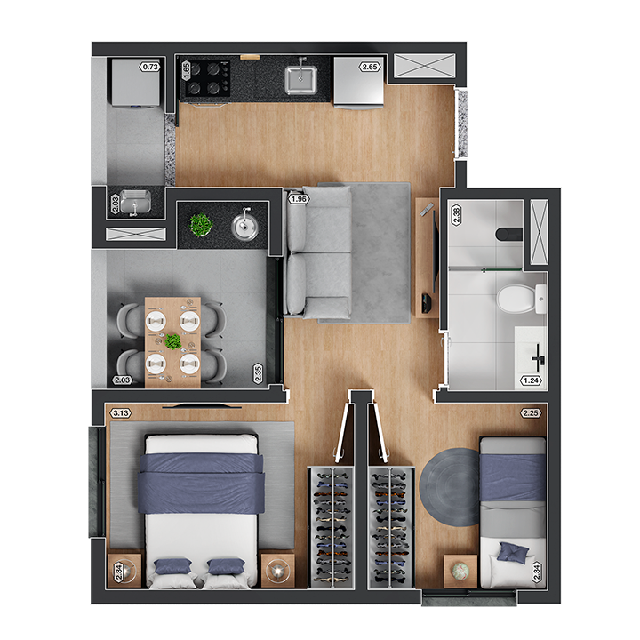 2 dormitórios - 37m² | Opção de Living ampliado​